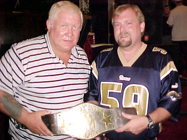 With yours truly, September, 2001. Photo thanx to Dave Millican, "The worlds second best belt maker." This is a big deal for me, as this is the first belt I ever saw change hands, when Harley dropped this belt to Pat O'Connor on St. Louis TV. Im proud to say I now own this belt, and its probably the most valued piece in my collection.